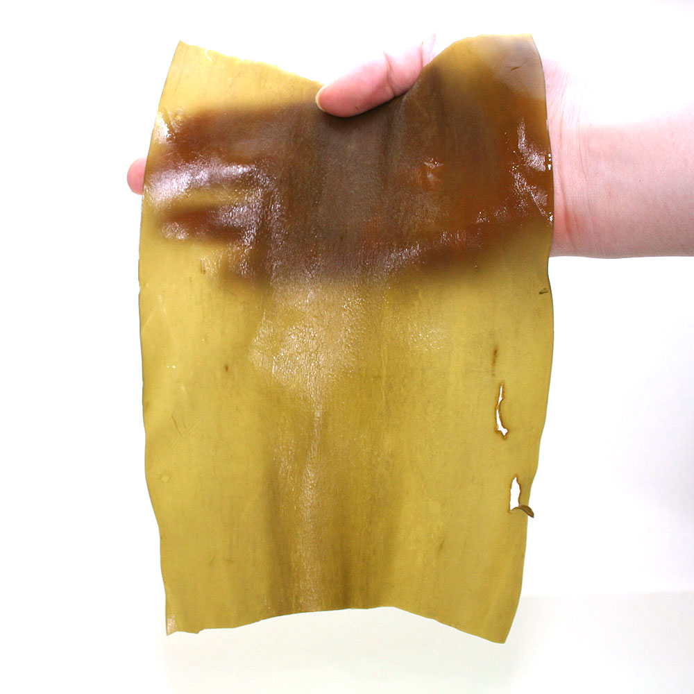 15分ほど水につけて、すっかり若かりし日の姿にもどった昆布です。幅は約12センチに広がりました。この幅の広さが根室産野菜昆布の特徴なのです。