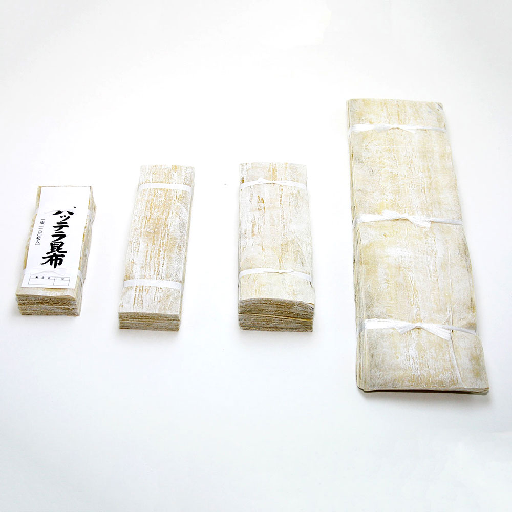 乾燥昆布を甘酢に浸し、表面を刃で削った加工品で、昆布表面近くは黒っぽい「おぼろ昆布」、内側の白い部分は「太白おぼろ」、そして核になる部分がこの「バッテラ昆布(白板昆布)」になります。やぶらず、薄く削るには職人による高度な技術が必要となります。