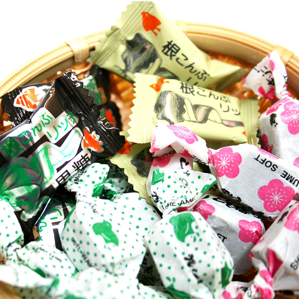 わかめ飴、しそ梅、根昆布リッチ、根昆布リッチ黒糖の4種類をセットにしました。素朴な口当たりとソフトな食感で食べだすと止まりません。